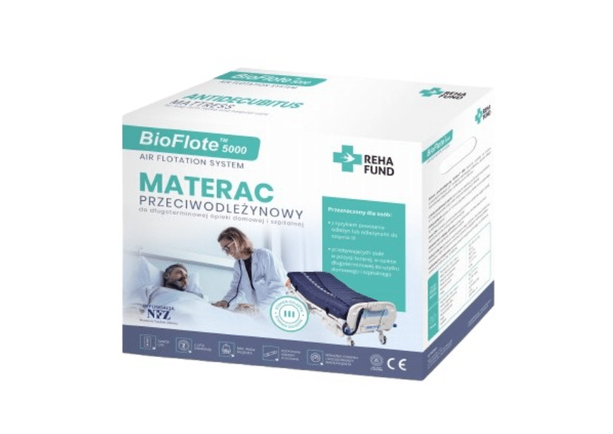 Materac przeciwodleżynowy BioFlote 5000 to podkład przeznaczony dla osób długotrwale unieruchomionych, które spędzają większość czasu w pozycji leżącej. Stosuje się go profilaktycznie, aby zapobiegać powstawaniu odleżyn, a także wspomagająco w procesie leczenia już istniejących zmian skórnych. Materac układa się bezpośrednio na tradycyjnym materacu łóżka, przykrywając go prześcieradłem.