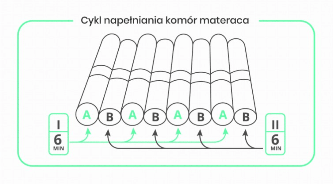 Urządzenie działa na zasadzie naprzemiennego pompowania powietrza do dwóch niezależnych sekcji podłużnych komór. Dzięki pracy cichej pompy żaden obszar ciała pacjenta nie jest narażony na długotrwały, stały nacisk. W efekcie poprawia się ukrwienie tkanek, zmniejsza ryzyko martwicy i powstawania odleżyn. Ciśnienie powietrza można regulować w zakresie od 40 do 110 mmHg, co pozwala dopasować ustawienia do wagi i potrzeb pacjenta.
