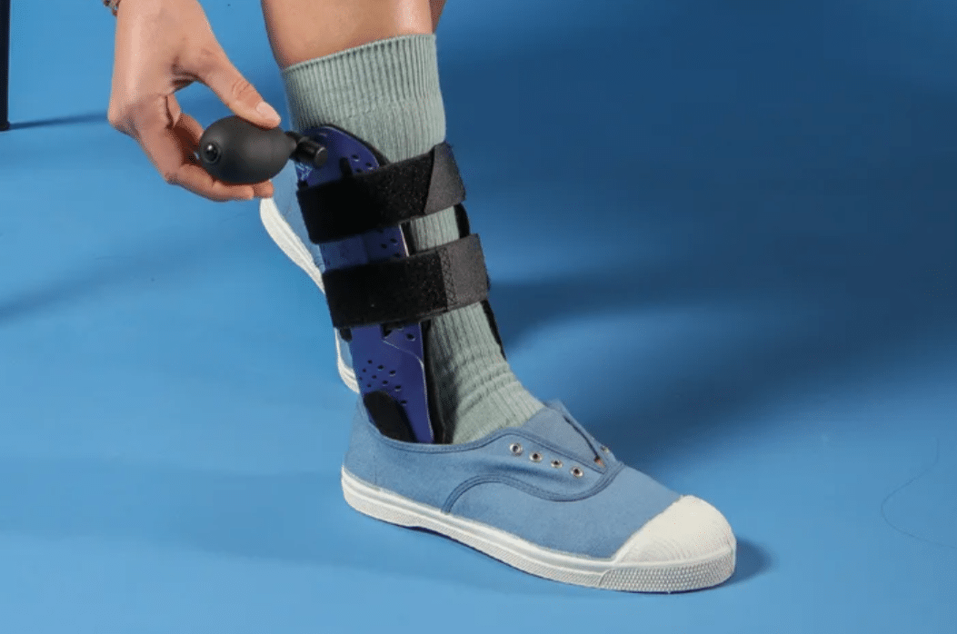 Stabilizator posiada w bocznych panelach komory powietrzne i pompkę. Po napompowaniu orteza dobrze stabilizuję nogę.